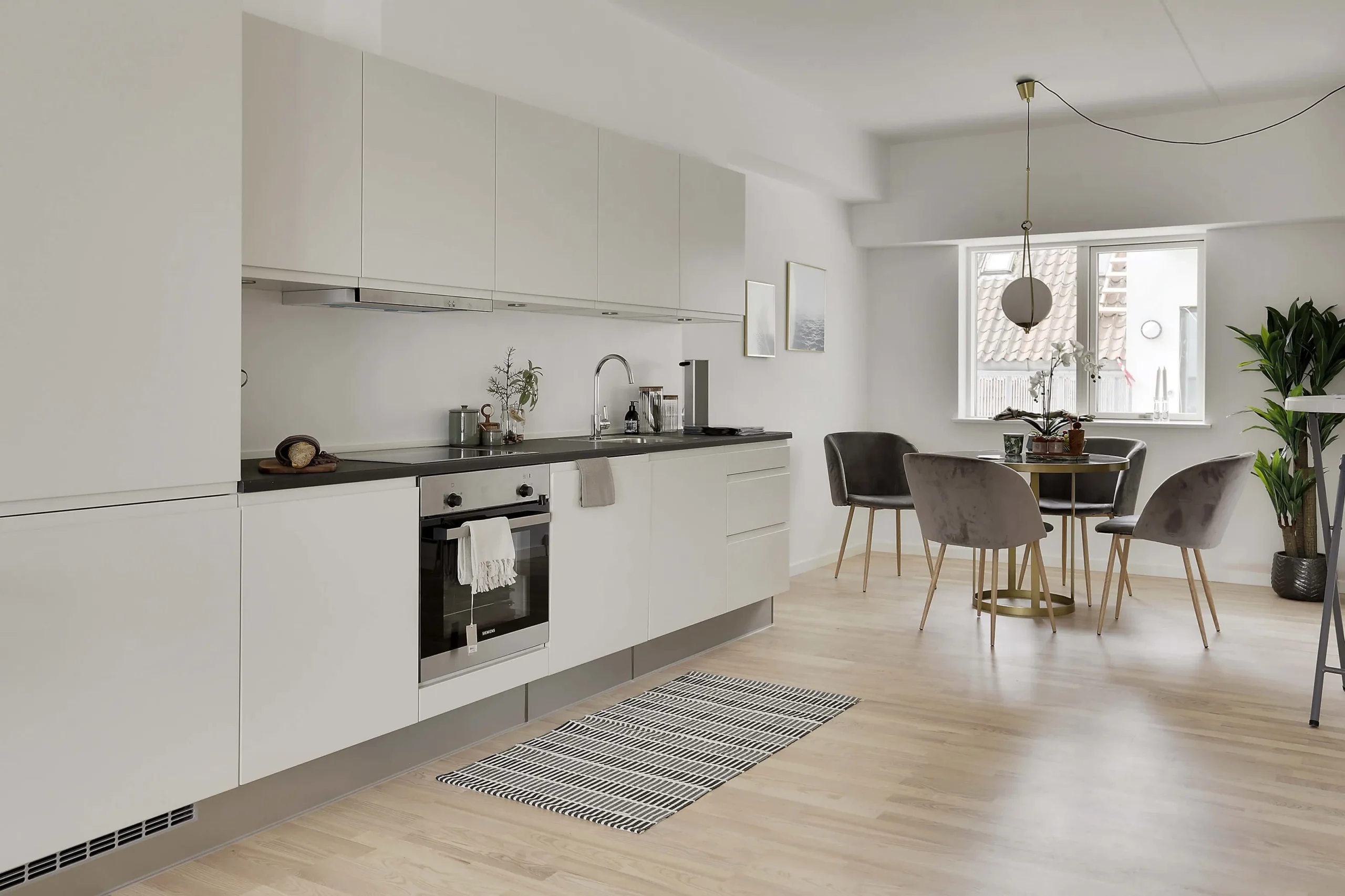 Der er egetræsgulve i opholdsrum. Køkkenelementer er fra HTH med hvide og stilrene låger med indfræsede greb. Hårde hvidevarer fra Siemens. Ovn. Glaskeramisk kogeplade. Integreret opvaskemaskine. Køl/frys integreret i køkkenet.