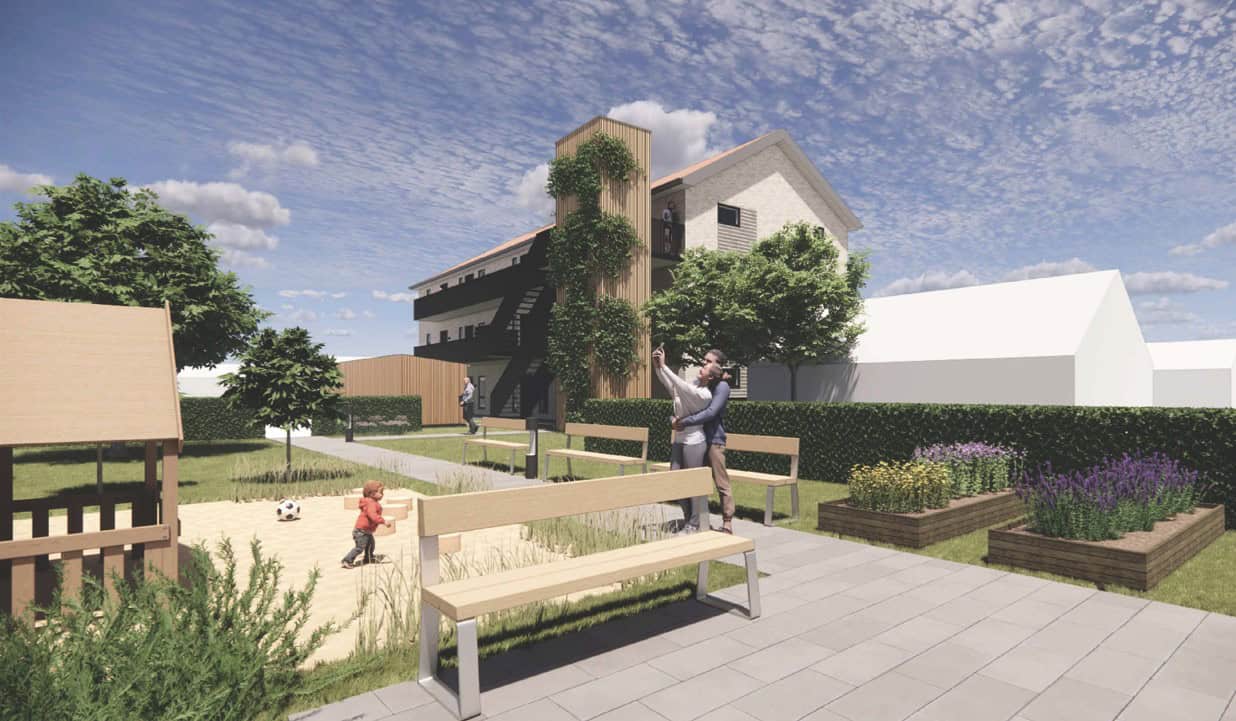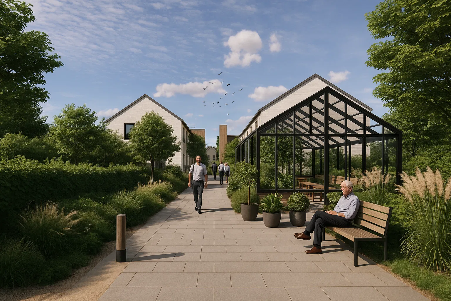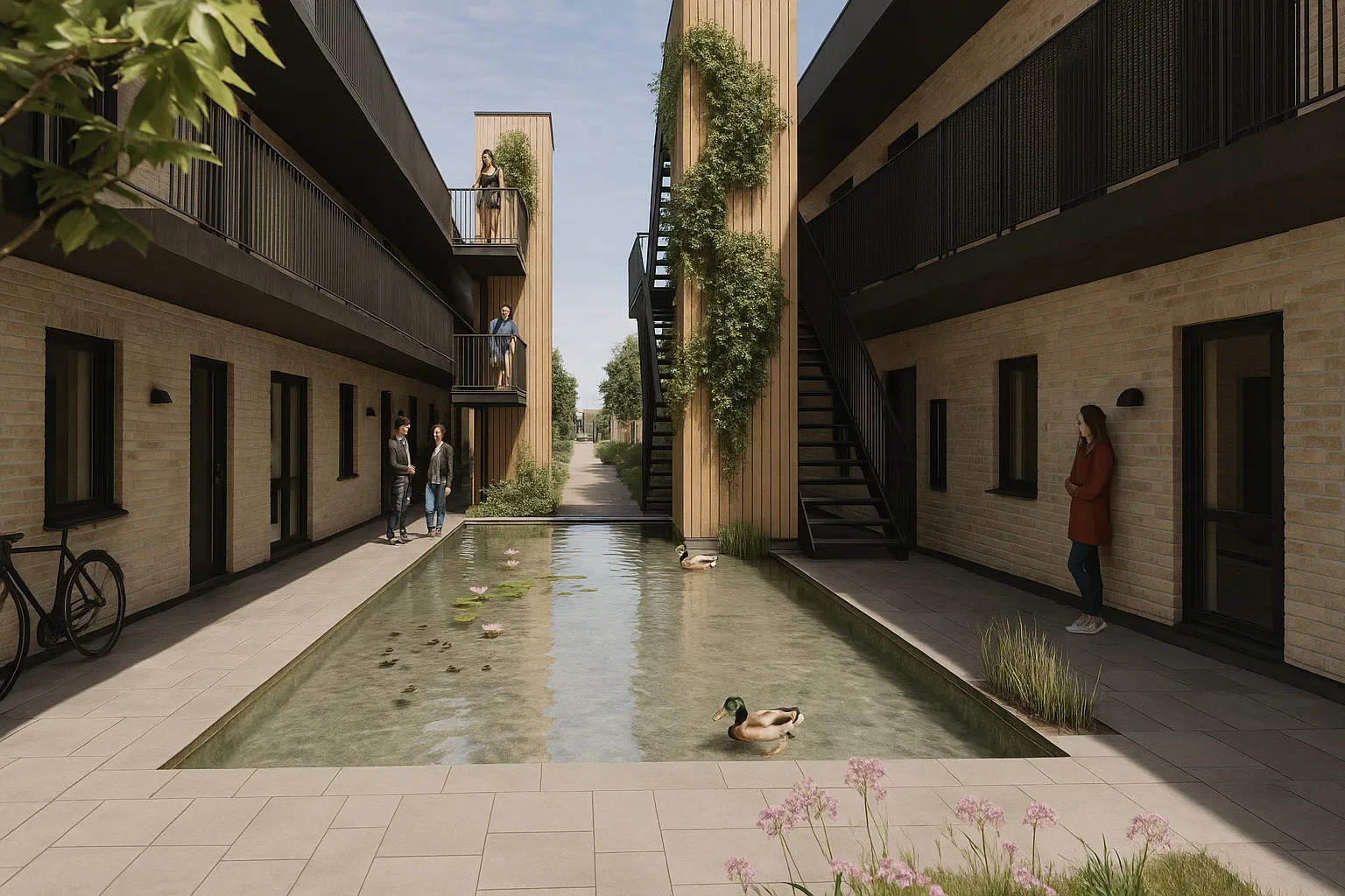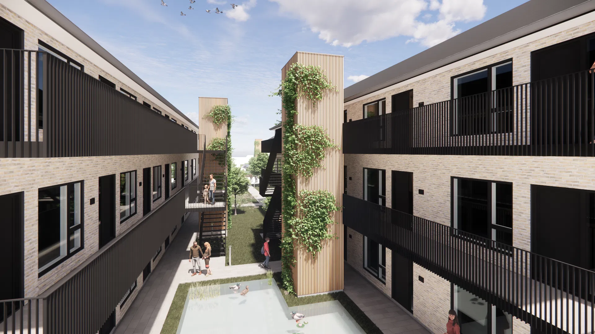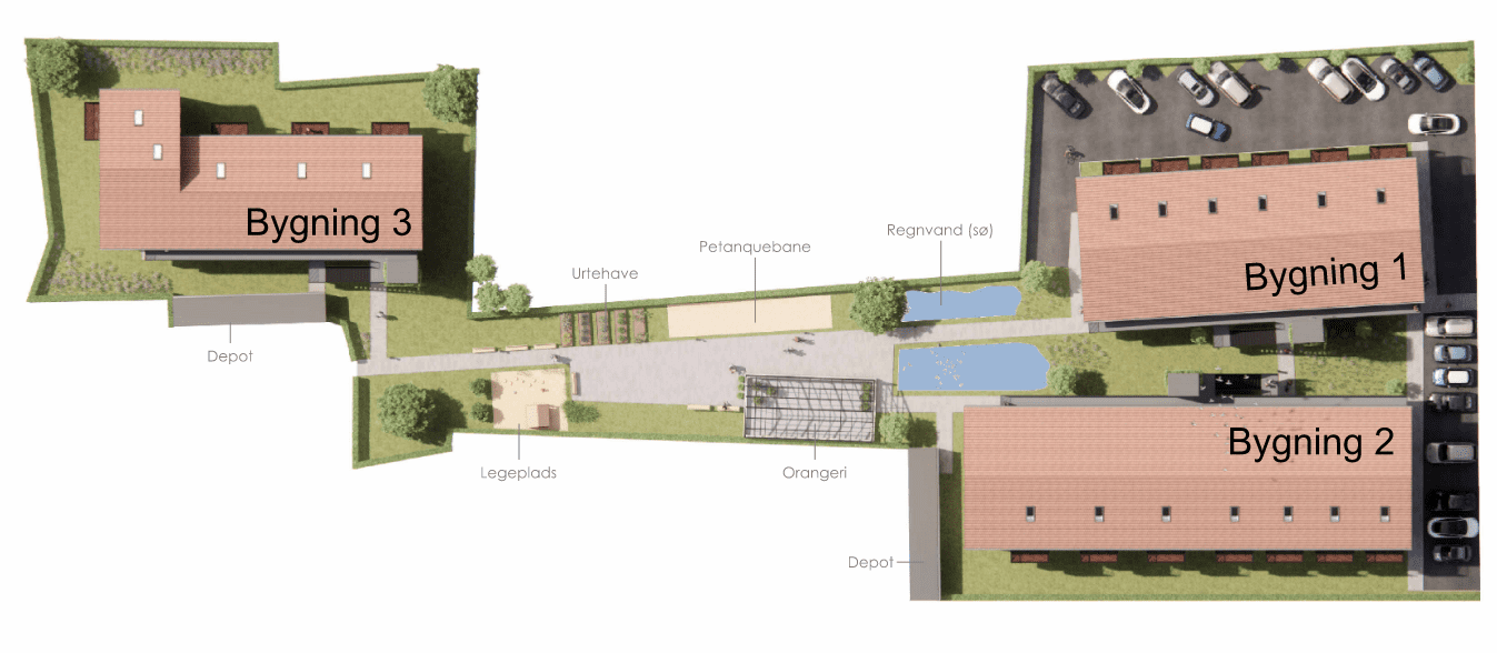 Midt i bebyggelsen ligger det grønne gårdrum – med legeplads, petanquebane, urtehaver og orangeri som naturlige samlingspunkter for fælles aktiviteter. Byggeriet bliver DGNB-certificeret, så der allerede fra begyndelsen er taget højde for både miljømæssig og social bæredygtighed med lavt energiforbrug. Lokal regnvandshåndtering sker via lavsø og regnbede.